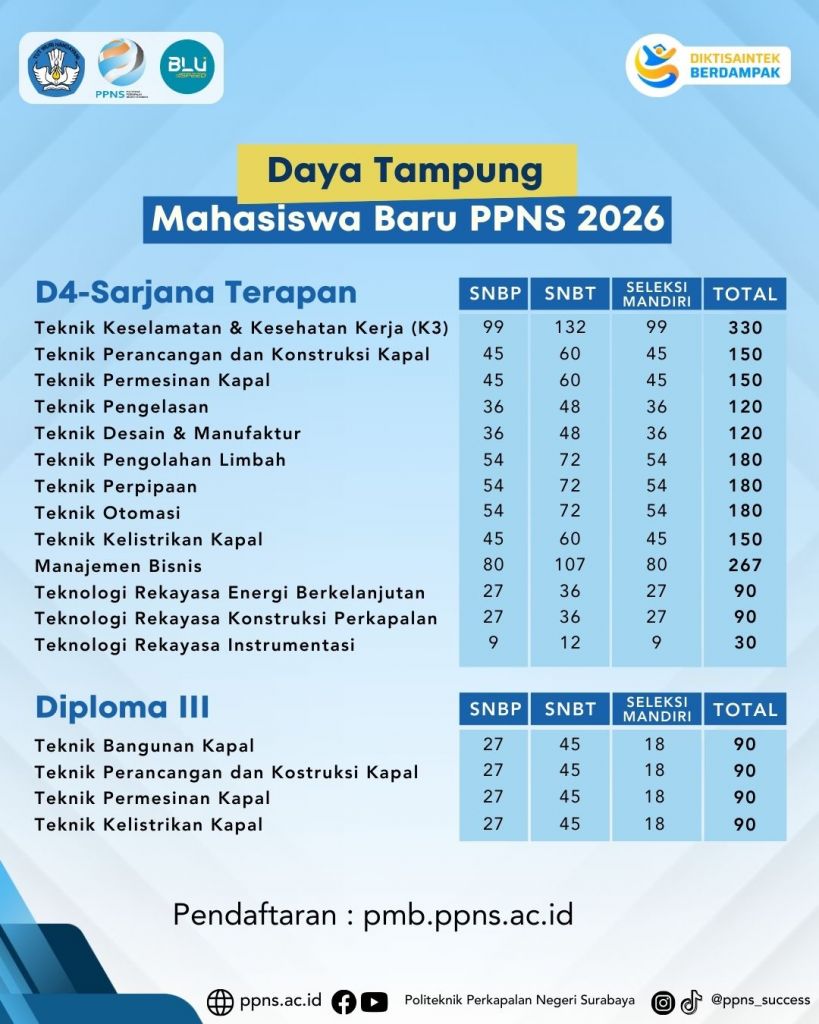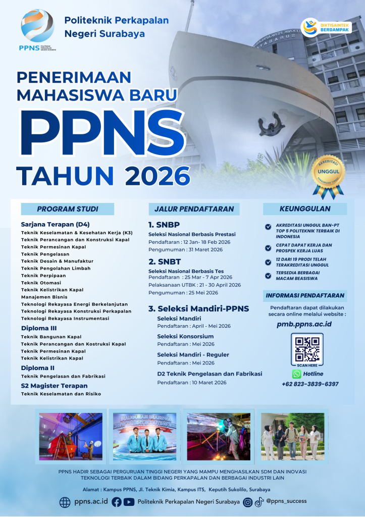 Pada Tahun Akademik 2026/2027, PPNS membuka proses seleksi Penerimaan Mahasiswa Baru dengan jalur :Ø Jalur Seleksi Nasional Berdasarkan Prestasi (SNBP)